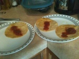 Moving on to prepare the yellow corn tortillas. They’re pretty small, but I always prefer corn tortillas over flour, just love the texture and homemade-like flavor. I shove the mushrooms to the side of the pan and let the tortillas heat up and cook for just a minute or so on each side so it’s nice and hot with a firmer structure. Then, lay em out and put salsa over it. After that, I lay the slices of “chik’n” on the base as well.