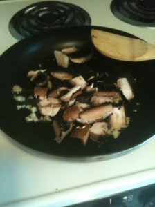 So as my mood immediately skyrocketed (who’s wouldn’t with an aroma of garlic, olive oil, and rosemary everywhere? HEAVEN), I let the mushrooms bathe in oil and garlic and cook to perfection. I moved on to prepare other things that would go along with this concoction. I heated up some MorningStar “Chik’n” and sliced em up. Even for you meat-lovers, these are really good. I suggest also the Buffalo ones for a kick. You can also see I grated just a little cheese on the side. If something needs to be cooked for a little bit, always take the time to prepare your other ingredients so you can have it timed perfectly (like when Chris gets out of the shower)!