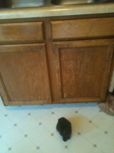 I always remember how good tomatoes were with salt were when I was a kid so I was following that craving. I grind some black pepper over them as well as some salt. These get put in a bowl along with some lemon juice and tossed around to get the flavor soaked in. As I finished chopping the veggies, I look to my left to see a tiny black blob on the floor. Oh yeah, that’s Nymeria.