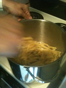 Meanwhile, Chris is cooking some penne al dente. I’m surprised there’s any left to cook due to his love for raw pasta.