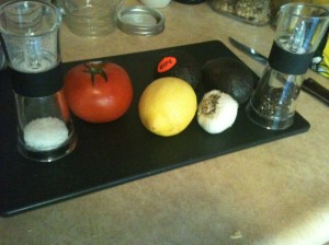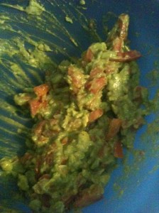 Now that you’ve scooped it all into a bowl, mash it up!! And have some fun with it! Next, cut up the lovely in-season tomato (small pieces), the garlic, and constantly put pepper and (especially) salt. Once you feel everything is properly seasoned, cut open a lemon, and squeeze that baby out. The lemon (I know people normally use lime–use whatever you want) will give it that nice zesty taste, but also it will preserve it if you want to keep it in the fridge for a bit. Avocados have a tendency to brown fairly easily.