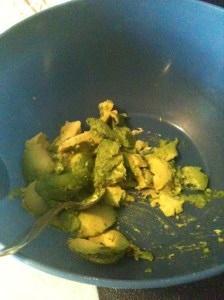 First, let’s tackle the avocados. Now I wish I took a picture of this, but the best technique I’ve found is to put the knife you’re using on the avocado, press down til you hit the core (the pit), and circle it all around the avocado until you’ve made it full-circle. Then grab each half of the avocado and pull! If they are the proper ripeness, they should pull a part easily, making it really easy to scoop the goods out.