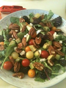 The feast, which was shared by the five (Megan, Ben (Alana’s cousins), Marga, Alana, and I) of us (a friend stopped over but was too full to eat), included: a beautifully presented salad with walnuts, avocado, mixed tomatoes, and blackberries… the chips and guacamole… corn on the cob, boiled in a pot… burgers with feta cheese stuffed into them… homemade potato salad…from Whole Foods (Marga’s would’ve been better)… grilled swordfish steaks… grilled pineapple… grilled peaches… and some pink wine, Rosé?
