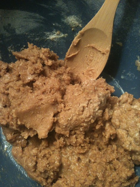 2. Mix the peanut butter, butter, honey, sugar, and egg til it’s smooth like…butter