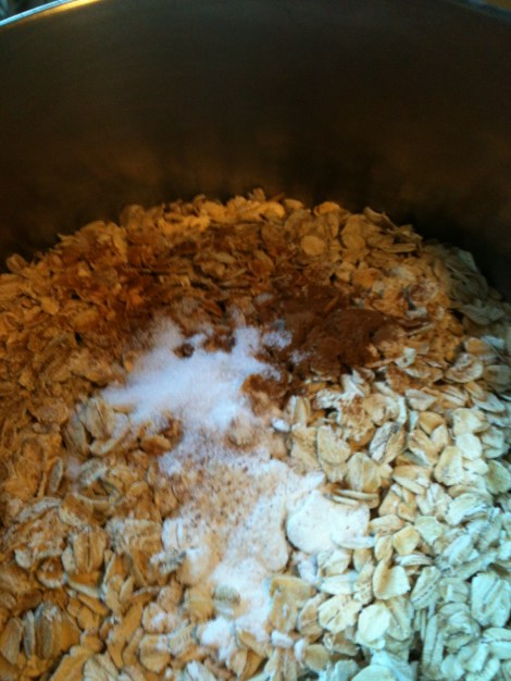 • First, in a medium bowl (please note: this will not be your final mixing bowl, I don’t know how many times I’ve short-sightedly followed a recipe thinking it was going to be the main mixing bowl), get your dry ingredients ready. Mix together the  flour, oats, baking powder, baking soda, salt and cinnamon.