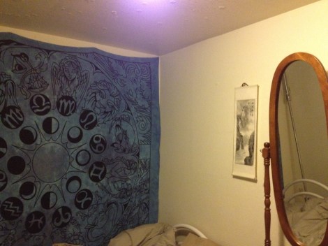 In the bedroom, we got a huge tapestry (my personal favorite color), a beautiful Japanese wall scroll straight from Japan, and a family mirror. If you look closely enough, you can see a new Olympic Barbell we bought from Salvation Army ($12.50–what a deal!) over the weekend.
