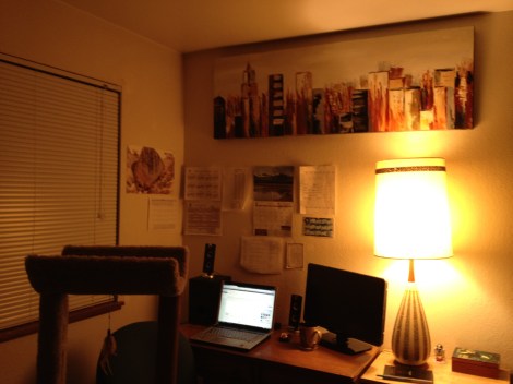 Now Chris calls this my “Office.” You can see my computer set up, with both of our work schedules, payrolls, calendars, and so forth pinned up in front of it. You can also see our new painting–of New York!