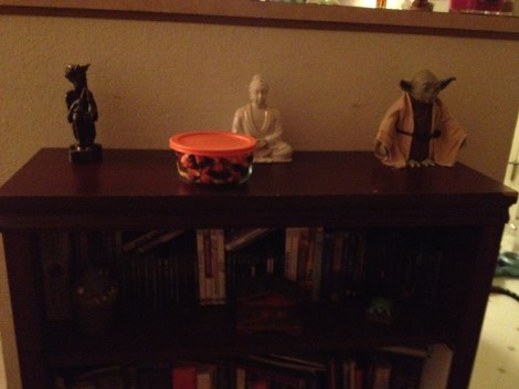 I always like to show our bookshelf of the gods (of sorts) and there happens to be a bowl of Halloween candy atop it. Which is the death of me.