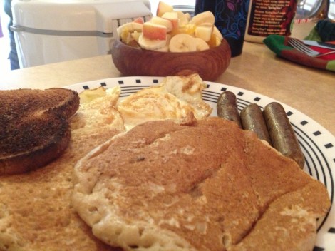 We like to go big on breakfast when we can. This is (not necessarily our typical) our ideal breakfast: whole-wheat Kodiak pancakes (or waffles), eggs, whole wheat toast with jam, Morningstar Sausage Links, and a big fruit salad. Sounds like a lot? You can bet our metabolism is going to be booted up from the start? And yes, I usually can’t finish everything so Chris gets to clean my plate.