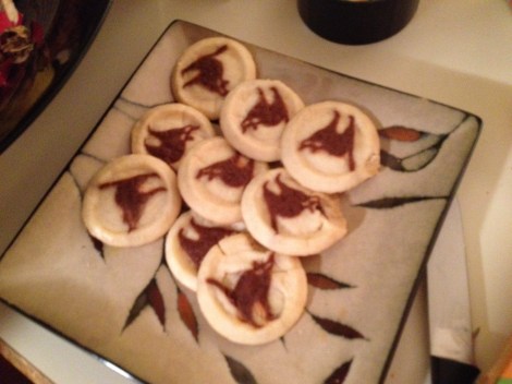 We put on Monsters Inc. (the most Halloween-y movie we could find) and enjoyed our dinner immensely. As soon as we were done, Chris immediately wanted to put the cookies in the oven. They’re his favorite kind of cookies. Basic sugar cookies with Halloween deco on them.